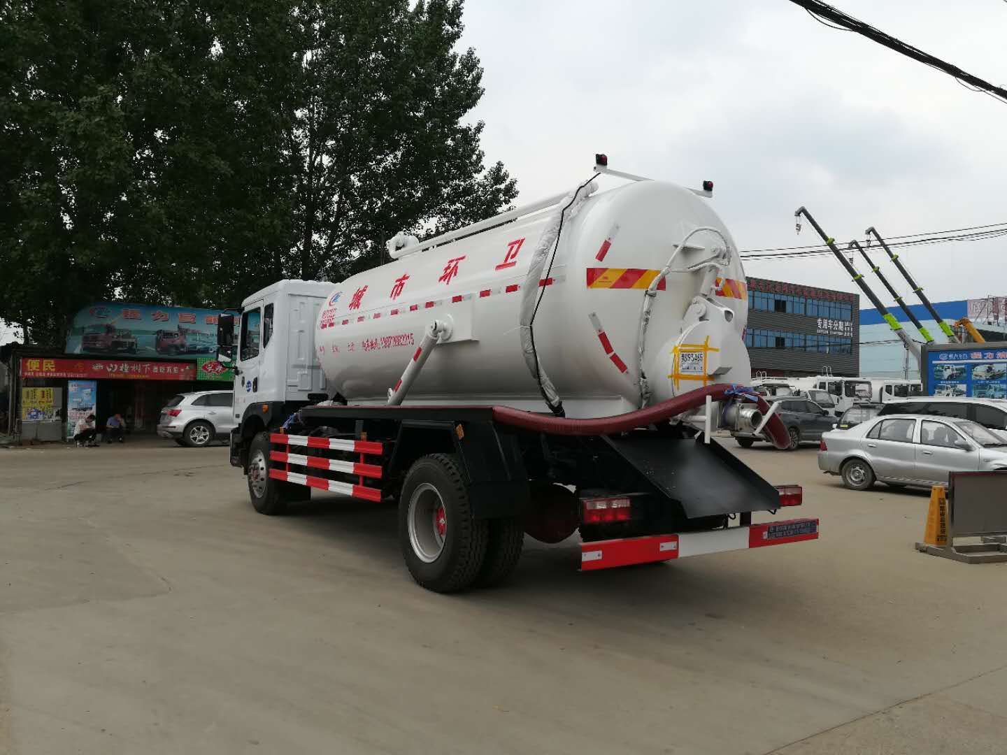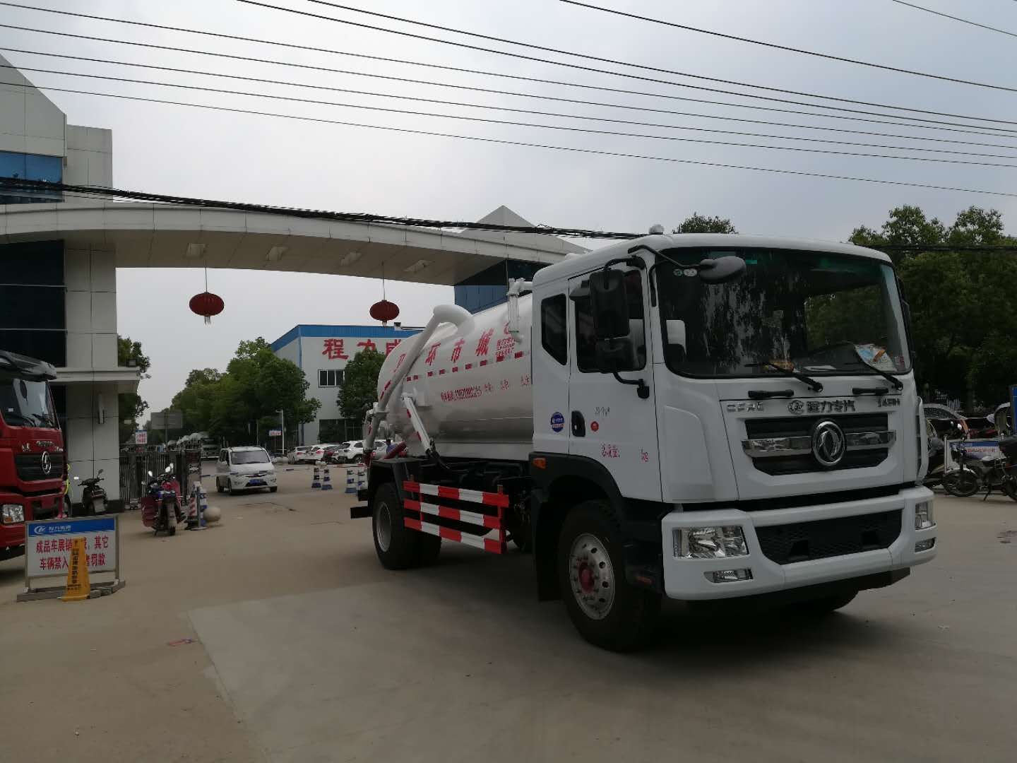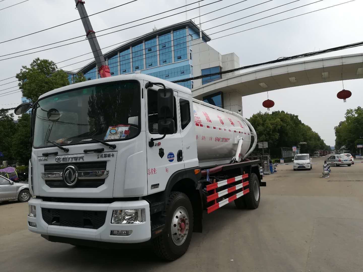 風D9吸污車罐體形狀為圓柱形,采用武鋼6mm厚優質碳鋼鋼板,罐體前部帶吸污窗,洗手裝置,舉升裝置,吸污管8米一根,罐體多種顏色選擇,其余按廠內標準配置制作。隨車配置大功率真空吸污泵和優質液壓系統,罐體封頭一次壓鑄成型、罐體可后開、雙頂自卸。罐內污物可通過后蓋直接傾倒,具有真空度高(比吸糞車的吸力更大)、噸位大、效率高、用途更廣泛的特點。(垂直吸程:≥8 m,工作壓力:8500Pa,理論抽速:120L/S,軸功功率:≤13kw,進排氣口徑:50mm抽滿罐時間<5 min排滿罐時間<4min。吸污車采用大功率真空泵,一次壓鑄成型的封頭-,加厚的抗壓罐體,雙頂液壓系統,是比吸糞車功能更強大的車型。下面是山東濰坊用戶再次到湖北程力訂購12方吸污車發車圖片: