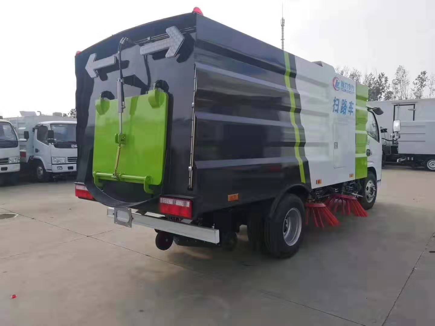上裝標配:帶4個掃盤、江鈴78馬力副發動機、三洋馬達、施耐德控制開關、海普瑞斯電磁閥組、無級變速自動離合器、免維護離心式自動風機、不銹鋼垃圾箱、中聯北極星電子水泵,尾部LED箭頭指示燈、手動泵應急系統、垃圾舉升自卸功能。