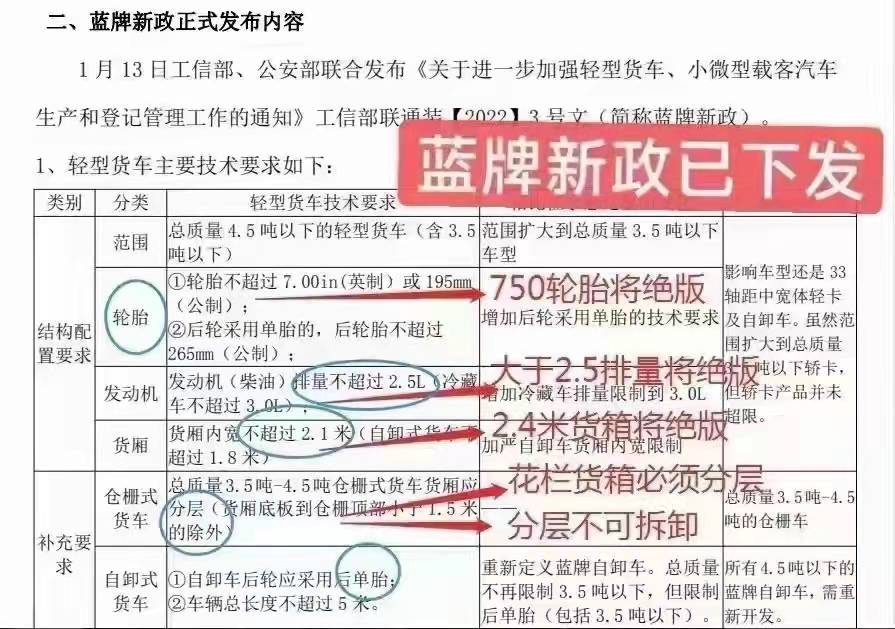 2022年藍牌專用汽車車輛上牌新規(guī)定解讀大噸小標不可取。工業(yè)和信息化部 公安部關(guān)于進一步加強輕型貨車、小微型載客汽車生產(chǎn)和登記管理工作的通知:近年來,輕型貨車“大噸小標”、小微型載客汽車違法載人載貨引發(fā)的道路交通事故多發(fā),給人民群眾生命財產(chǎn)安全造成重大損失,成為嚴重道路交通安全隱患。為貫徹落實《全國安全生產(chǎn)專項整治三年行動計劃》和《道路運輸安全專項整治三年行動實施方案》要求,切實加強車輛生產(chǎn)和登記管理,進一步提高輕型貨車、小微型載客汽車安全技術(shù)性能,現(xiàn)將有關(guān)事項通知如下: 一、提高輕型貨車、小微型載客汽車安全技術(shù)要求 (一)為從產(chǎn)品源頭有效消除輕型貨車“大噸小標”、超載運輸隱患,遏制小微型載客汽車非法改裝行為,自本通知發(fā)布之日起,新申報《道路機動車輛生產(chǎn)企業(yè)及產(chǎn)品公告》(以下簡稱《公告》)的輕型貨車產(chǎn)品應當增加貨廂材質(zhì)、厚度、重量等參數(shù)信息,小微型載客汽車產(chǎn)品應當增加座椅布置、固定方式等參數(shù)信息。新申報產(chǎn)品及已列入《公告》的在產(chǎn)產(chǎn)品,除需符合國家有關(guān)政策和強制性標準要求外,還需滿足本通知附件《輕型貨車、小微型載客汽車安全技術(shù)規(guī)范》(以下簡稱《技術(shù)規(guī)范》)規(guī)定要求。不符合本通知《技術(shù)規(guī)范》要求的新產(chǎn)品,工業(yè)和信息化部將不予公告。 (二)不符合本通知《技術(shù)規(guī)范》要求的在產(chǎn)產(chǎn)品,2022年3月1日起,生產(chǎn)企業(yè)應立即停止生產(chǎn),相關(guān)機構(gòu)應立即停止接收相關(guān)產(chǎn)品合格證信息;其中,對已列入《公告》的排量大于2.5升但符合本通知其他要求的輕型貨車在產(chǎn)產(chǎn)品,給予生產(chǎn)銷售過渡期6個月,過渡期滿后,生產(chǎn)企業(yè)應立即停止生產(chǎn),相關(guān)機構(gòu)應立即停止接收相關(guān)產(chǎn)品合格證信息。 (三)對2022年3月1日前已生產(chǎn)并已上傳合格證、但不符合本通知《技術(shù)規(guī)范》要求的庫存產(chǎn)品,生產(chǎn)企業(yè)可向工業(yè)和信息化部提出庫存延期銷售申請,并隨附庫存清單以及生產(chǎn)企業(yè)關(guān)于該型產(chǎn)品無“大噸小標”等違規(guī)情況、自愿承擔相關(guān)法律責任的書面材料,經(jīng)履行核實、公示等相關(guān)程序,可給予6個月延期銷售、注冊登記期限。根據(jù)道路運輸安全專項整治行動進展的具體情況,工業(yè)和信息化部、公安部將適時修訂完善《技術(shù)規(guī)范》。 二、落實生產(chǎn)企業(yè)產(chǎn)品安全質(zhì)量、生產(chǎn)一致性主體責任 (四)生產(chǎn)企業(yè)應當提高安全責任和風險防控意識,嚴格落實產(chǎn)品安全質(zhì)量、生產(chǎn)一致性主體責任,合法守信進行生產(chǎn)經(jīng)營,健全相關(guān)管理制度,加強車輛產(chǎn)品出廠前安全質(zhì)量檢驗,確保批產(chǎn)產(chǎn)品符合國家強制性標準和有關(guān)規(guī)定要求,確保批產(chǎn)產(chǎn)品與公告型式批準車型規(guī)格參數(shù)一致,切實提高車輛產(chǎn)品安全性能。 (五)采用委改方式生產(chǎn)的貨車整車生產(chǎn)企業(yè)承擔委改產(chǎn)品安全質(zhì)量、生產(chǎn)一致性完全責任,要制定辦法對委改企業(yè)加強管理,對委托改裝車輛產(chǎn)品實施質(zhì)量控制和生產(chǎn)一致性管理,保證委改產(chǎn)品參數(shù)與許可參數(shù)一致。 (六)生產(chǎn)企業(yè)應加強對機動車整車出廠合格證管理,在機動車制造完畢且檢驗合格后實時填報、傳送合格證電子信息,合格證載明的信息應當與《公告》產(chǎn)品技術(shù)參數(shù)以及產(chǎn)品實際技術(shù)參數(shù)一致,不得銷售尚未傳送合格證電子信息的機動車,嚴禁上傳未生產(chǎn)下線機動車整車合格證電子信息。嚴禁為同一機動車配發(fā)不同《公告》型號的機動車整車出廠合格證,嚴禁對檢驗不合格、不符合生產(chǎn)一致性要求的車輛出具整車出廠合格證明。對不符合本通知要求的已公告產(chǎn)品,生產(chǎn)企業(yè)應組織進行設計整改,經(jīng)整改確認符合要求的,可恢復其產(chǎn)品生產(chǎn)及合格證傳送。 三、嚴把車輛產(chǎn)品檢驗機構(gòu)產(chǎn)品檢測關(guān) (七)承擔《公告》車輛產(chǎn)品檢測工作的車輛檢驗機構(gòu)要嚴把產(chǎn)品檢測關(guān),在對申報《公告》的樣車進行檢驗時,嚴格按照國家標準和有關(guān)規(guī)定進行,不得減少檢驗項目,不得降低檢驗標準,并嚴格執(zhí)行檢驗樣品保留3個月的樣品追溯制度。 (八)檢驗機構(gòu)要嚴格貨車產(chǎn)品空載檢測,重點檢測貨車產(chǎn)品整備質(zhì)量,保證在車輛隨車工具、備胎、水箱、油箱按規(guī)定配備、加注的條件下進行測量,嚴格核驗車輛發(fā)動機、輪胎、車橋、鋼板彈簧等配置與申報車型總質(zhì)量是否匹配,檢驗過程視頻應當留存不少于6年;對涉及滿載檢測的,要在檢測報告中說明載荷加裝方式方法,并附載荷加裝照片,保存相關(guān)視頻,其中,采用大型砝碼等模擬載荷進行滿載檢測的,還應評價車廂(車斗)強度與車輛申報承載能力是否匹配。發(fā)現(xiàn)車型配置、載貨空間與總質(zhì)量不匹配、不合理,或存在生產(chǎn)