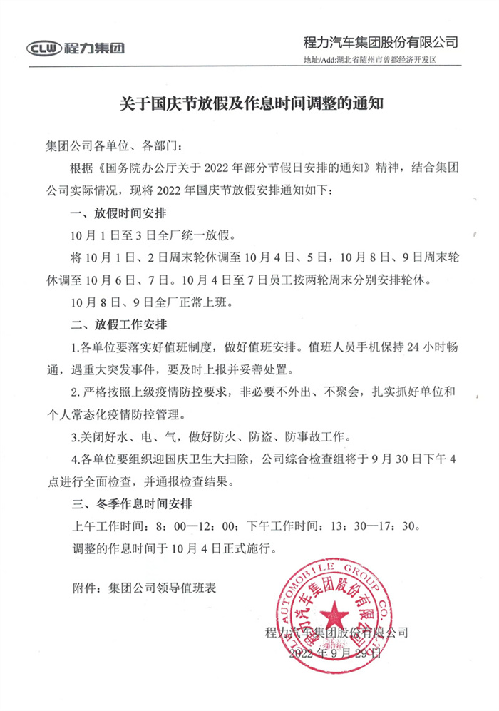 湖北程力集團(tuán)關(guān)于國慶節(jié)放假及作息時間調(diào)整的通知