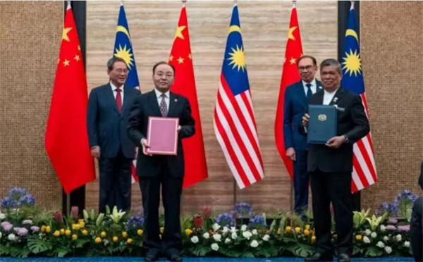 會談后,在兩位領導人的共同見證下,兩國簽署了14項合作協(xié)議和備忘錄,其中包括兩國民眾期待已久的《馬來西亞鮮食榴梿輸華植物檢疫要求議定書》,也意味著馬來西亞新鮮榴蓮可以向中國出口。簽署儀式于今天上午11時許在布城首相辦公室舉行,多位馬來西亞內閣部長和中方部長分別代表兩國簽署。