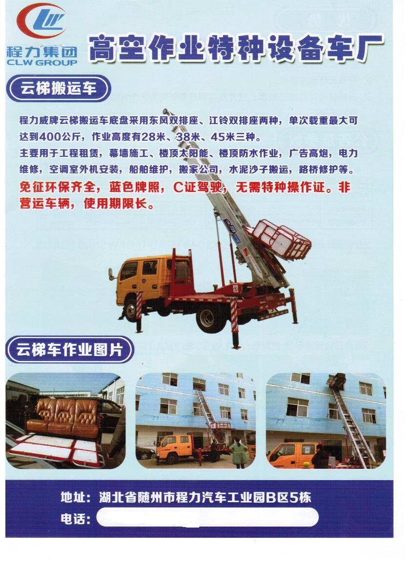 云梯搬家車是利用車載云梯設備將物料搬運上樓的專項作業車輛,具有操作簡便易學,靈活性強,運用面廣,工作效率高,性能卓越等特點。主要用于工程租憑,幕強施工,樓頂太陽能,樓頂防水作業,廣告高炮,電力維修,空調室外機安裝,船舶維護,搬家公司,水泥沙子搬運,路橋修護等,作業范圍可達28米相當于10層樓高,云梯車的承載貨物重量每次可達300公斤,藍色牌照,C證駕駛室,無需特種操作證。非營運車輛,使用期限30年。