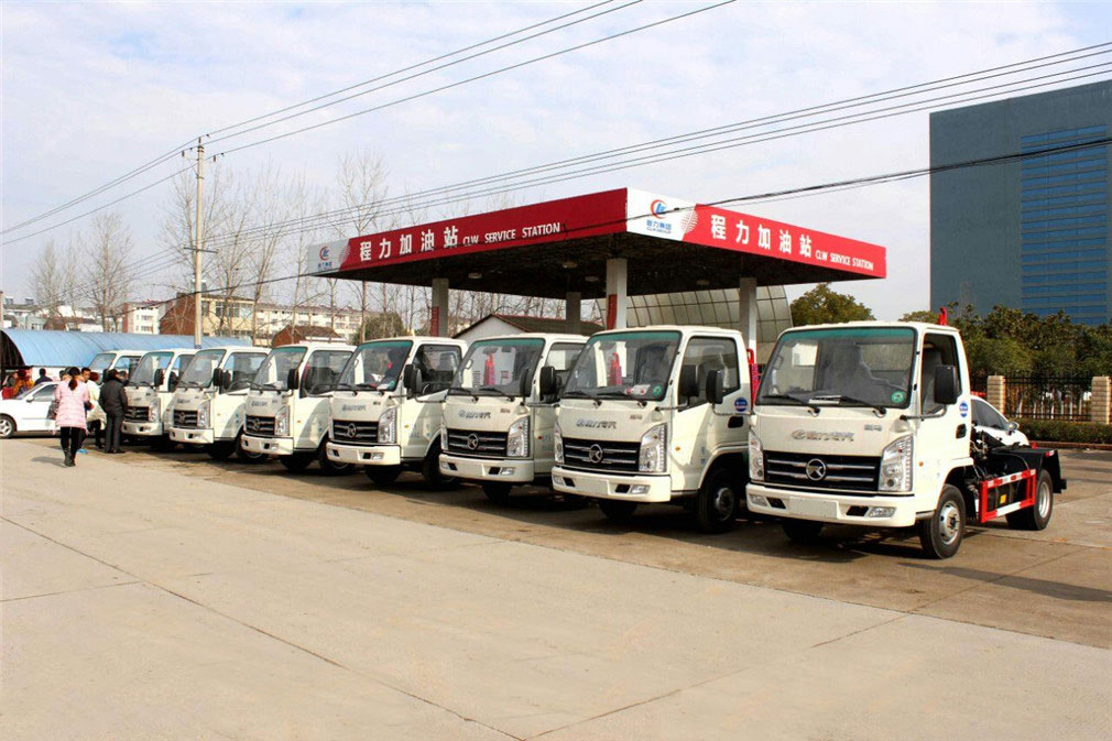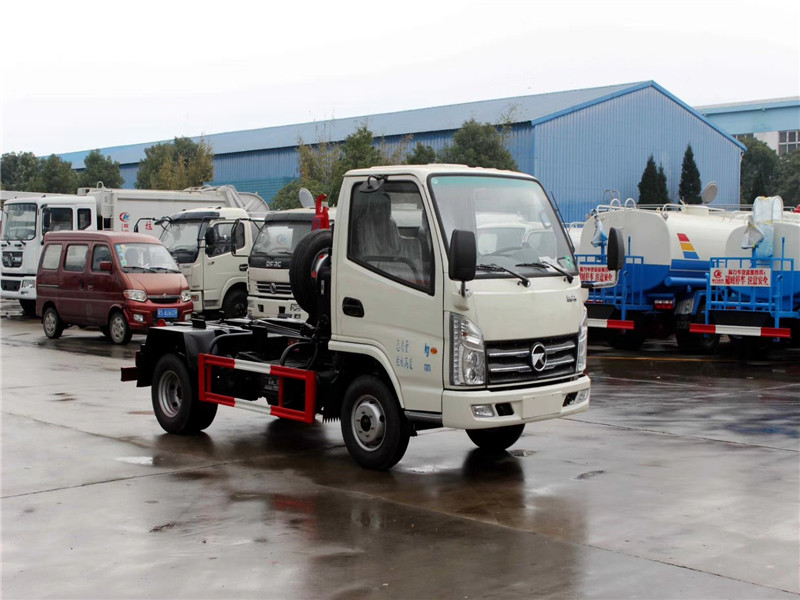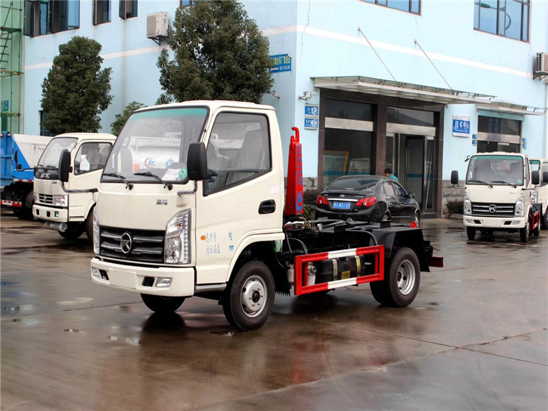 凱馬4方勾臂式垃圾車底盤配置: 凱馬勾臂式垃圾車,采用凱馬原廠KMC1036Q280DP6型號載貨汽車底盤,單排駕駛室。采用濰柴WP2.1Q82E50型號國六發動機,2088ml排量,5檔手動變速箱,2600mm軸距,配6.00-14LT型號輪胎,帶方向助力、離合助力、ABS防抱死系統、冷暖空調、機械減震座椅,配置豐富實用,駕乘舒適性高。 湖北程力凱馬3-4方勾臂式垃圾車專用功能特點: 凱馬勾臂式垃圾車的收運方式是目前世界上廣泛采用的垃圾收運方式,可以實現一車多箱,大大降低了使用成本,提高工作效率。 勾臂式垃圾車同時具備貨物自卸和箱體自動裝卸兩種功能,而且這兩種功能由一個拉臂車完成,工作效率高。這兩種功能的操作和轉換都是由液壓系統實現的。 凱馬3-4方勾臂式垃圾車,垃圾箱操作方法: 1、將鎖緊鉤操作手柄推至收回位置,鎖緊油缸收回,使鎖緊架收回并將翻轉架與附車架鎖緊固定; 2、將拉臂操作手柄拉起到伸起位置,拉臂油缸伸出,活動拉臂繞翻轉翻轉架前鉸鏈軸旋轉,拉臂處于鉤箱位置,適當調整拉臂鉤高度并與箱體彎鉤對準; 3、當拉臂鉤鉤到箱體彎鉤時,繼續推下拉臂操作手柄到落下位置,使垃圾箱體繼續上車; 4、當垃圾車箱體落放到附車架上后,松開拉臂操作手柄使其回到中位,再將鎖緊鉤操作手柄拉起至鎖緊位置,鎖緊油缸伸出,使鎖緊架翻起并將翻轉架與垃圾箱體鎖緊固定,松開手柄使之回中位; 完成垃圾車箱體的裝車工作,松開取力器,整車可以運輸行駛