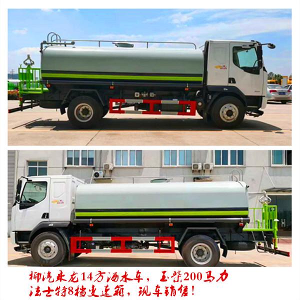 國六柳汽單橋14方綠化噴灑車(霧炮灑水車)底盤配置:軸距4500、L31駕駛室、YCS04200-68、8JS75C、Φ395離合、3.6T前橋、8T/4.875后橋、板簧8/9+5、車架231(6)、200L鐵油箱、 輪胎10.00R20、國產方向機、半浮式駕駛室懸置、手動液壓翻轉、機械減振司機座椅、夾層玻璃、加厚鋼圈、MP3+收音機、空調、ABS、車載終端(行駛記錄儀+兼容北斗GPS)、多態開關、右轉提示功能、國產閥、ABS、自調臂、免維護電池、電控硅油風扇、車下起動停機功能、駕駛室電源總開關、PTO開關、遠程PTO接口、取力器開關及電磁閥、取力器氣管路,罐體容積15方,主管道加粗,罐體自動焊,大梁不動焊。