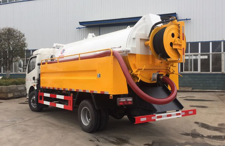 5】程力吸污車具有液壓舉升自卸功能,便于將各種污泥傾倒干凈。而且后罐門可以液壓自動開啟,便于清理罐體內的沉積物、凝固物及對罐體內部進行維修、保養。